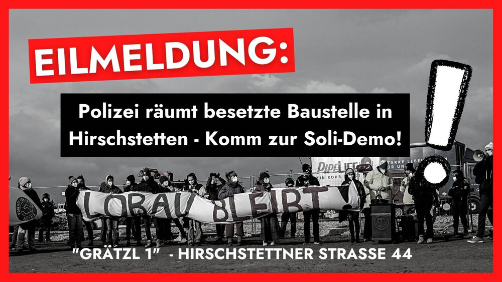 EIL: Die Polizei beginnt gerade damit, die besetzte Baustelle bei der Hirschstettnerstraße 44 zu räumen! Daher haben wir spontan eine Kundgebung neben der Räumung angemeldet, zu der wir alle aufrufen, hinzukommen und sich solidarisch zu zeigen.