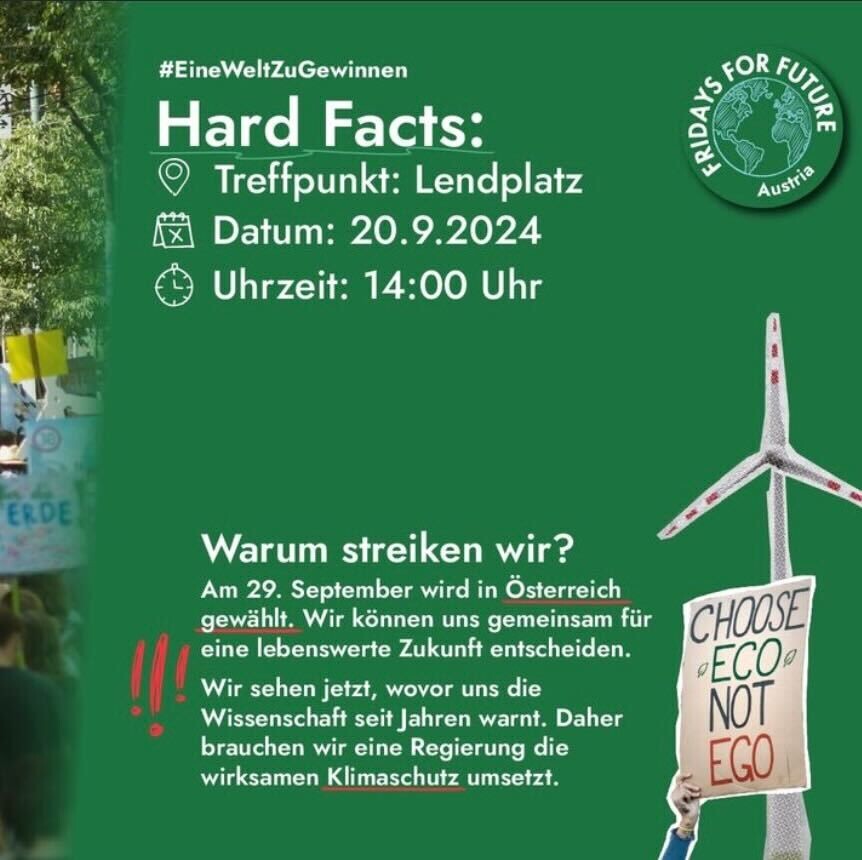 Möchtest du uns helfen die Info weiterzutragen? Benutze diesen Link auf deiner Website: https://fridaysforfuture.at/events/weltweiter-klimastreik-20-09-24