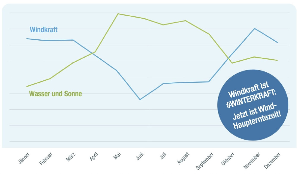 Solar, Wind, Wasserkraft, Geothermie und Biomassekraftwerke ergänzen einander in der Stromerzeugung. Wir können uns also nicht dafür entscheiden, nur eine dieser Energiequellen auszubauen. Während die Photovoltaikanlage untertags den meisten Strom liefert, kann sie in der Nacht nichts beitragen. Windräder hingegen können auch in der Nacht Strom erzeugen, wenn der Wind weht. Außerdem liefert die Windkraft im Winter am meisten Strom - genau dann, wenn der Wasserstand der Flüsse niedrig ist und die Sonne weniger scheint. Deswegen braucht es einen Mix aus allen erneuerbaren Stromquellen zusammen mit dem Ausbau von Speichern und Stromnetzen.
