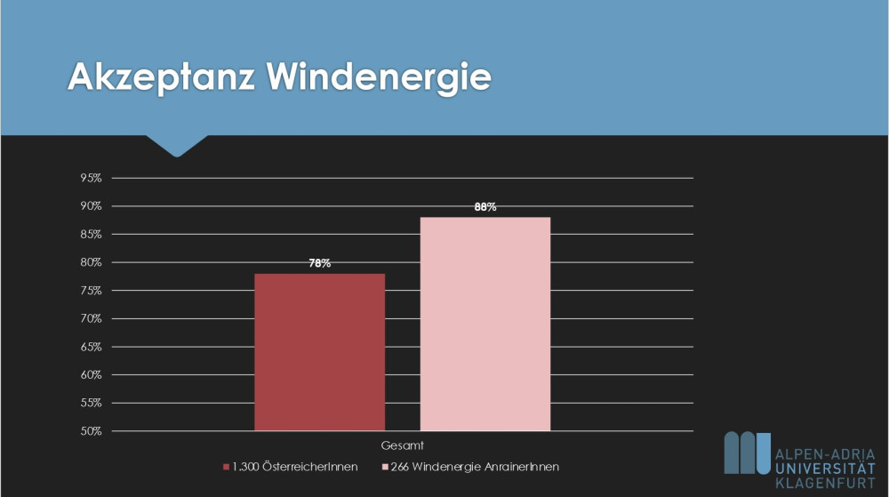 Von den 1300 befragten Österreicher:innen akzeptieren 78% Windkraft. Unter den Teilnehmenden waren 266 Anrainer:innen eines Windparks oder einer Windkraftanlage. Bei ihnen liegt die Akzeptanz sogar bei 88%.